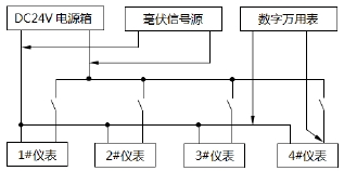 切斷24V 電源箱的供電,把24V電源輸出母線定為起點接入毫伏電壓信號,用數字萬用表在回路的終點4號儀表處測量毫伏電壓,測量其他儀表的操作方法也基本一致。