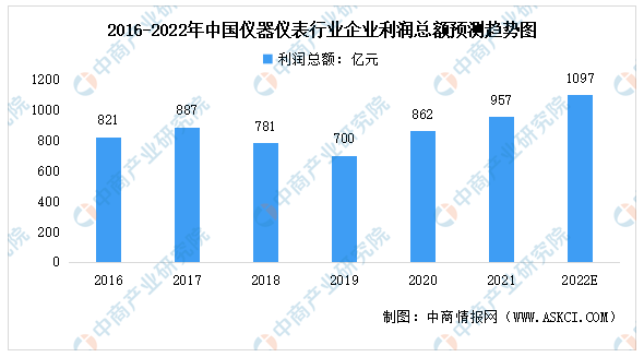 其增長速度整體而言高于主營收入的增長速度,說明我國儀器儀表行業的盈利能力不斷提升,已步入高質量發展階段。中商產業研究院預測,2022年我國儀器儀表行業企業利潤總額將達1097億元。
