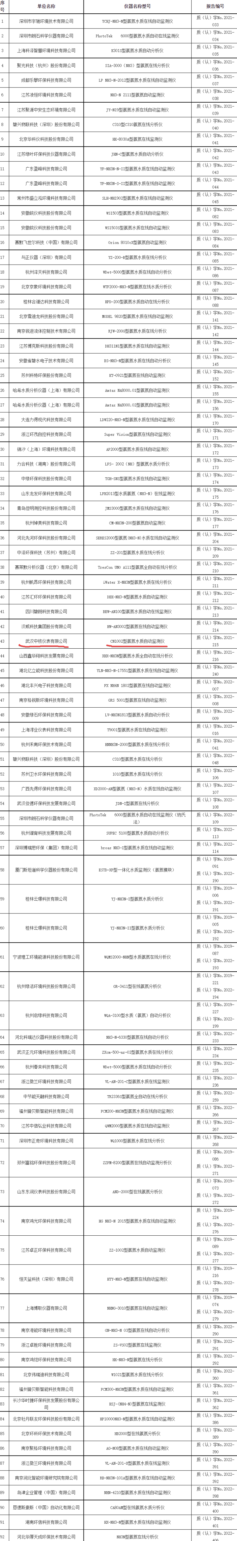 氨氮水質在線自動監測儀適用性檢測合格名錄(符合HJ 101-2019標準) (截至2022年12月31日)