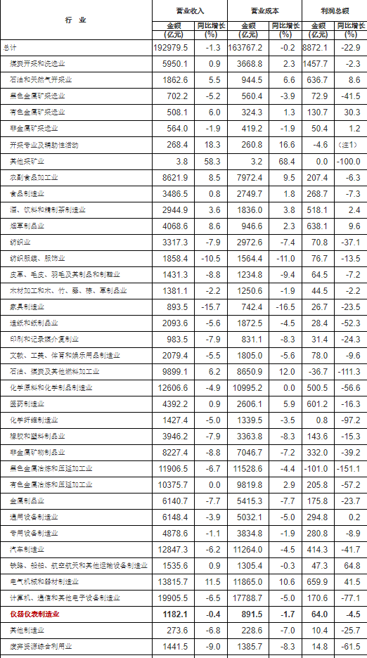 專用設備制造業下降8.9%,紡織業下降37.1%,非金屬礦物制品業下降39.2%,汽車制造業下降41.7%,化學原料和化學制品制造業下降56.6%,有色金屬冶煉和壓延加工業下降57.2%,計算機、通信和其他電子設備制造業下降77.1%,石油煤炭及其他燃料加工業、黑色金屬冶煉和壓延加工業均由盈利轉為虧損。