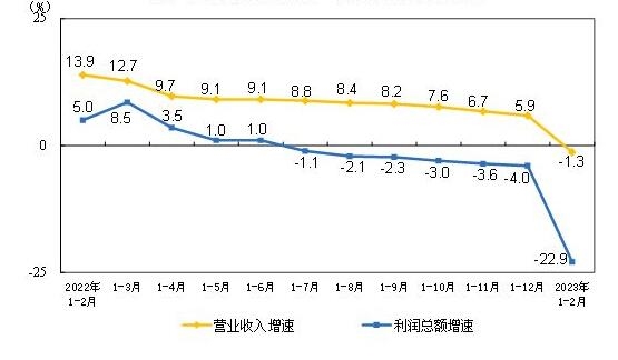1—2月份,規模以上工業企業實現營業收入19.30萬億元,同比下降1.3%;發生營業成本16.38萬億元,下降0.2%;營業收入利潤率為4.60%,同比下降1.29個百分點。